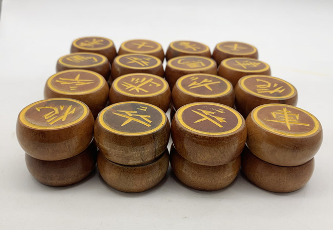 Quân cờ tướng gỗ nhãn được tiện tròn thủ công trên bàn tiện, tang cầm quân cờ là kiểu tang trống gù rất đẹp.